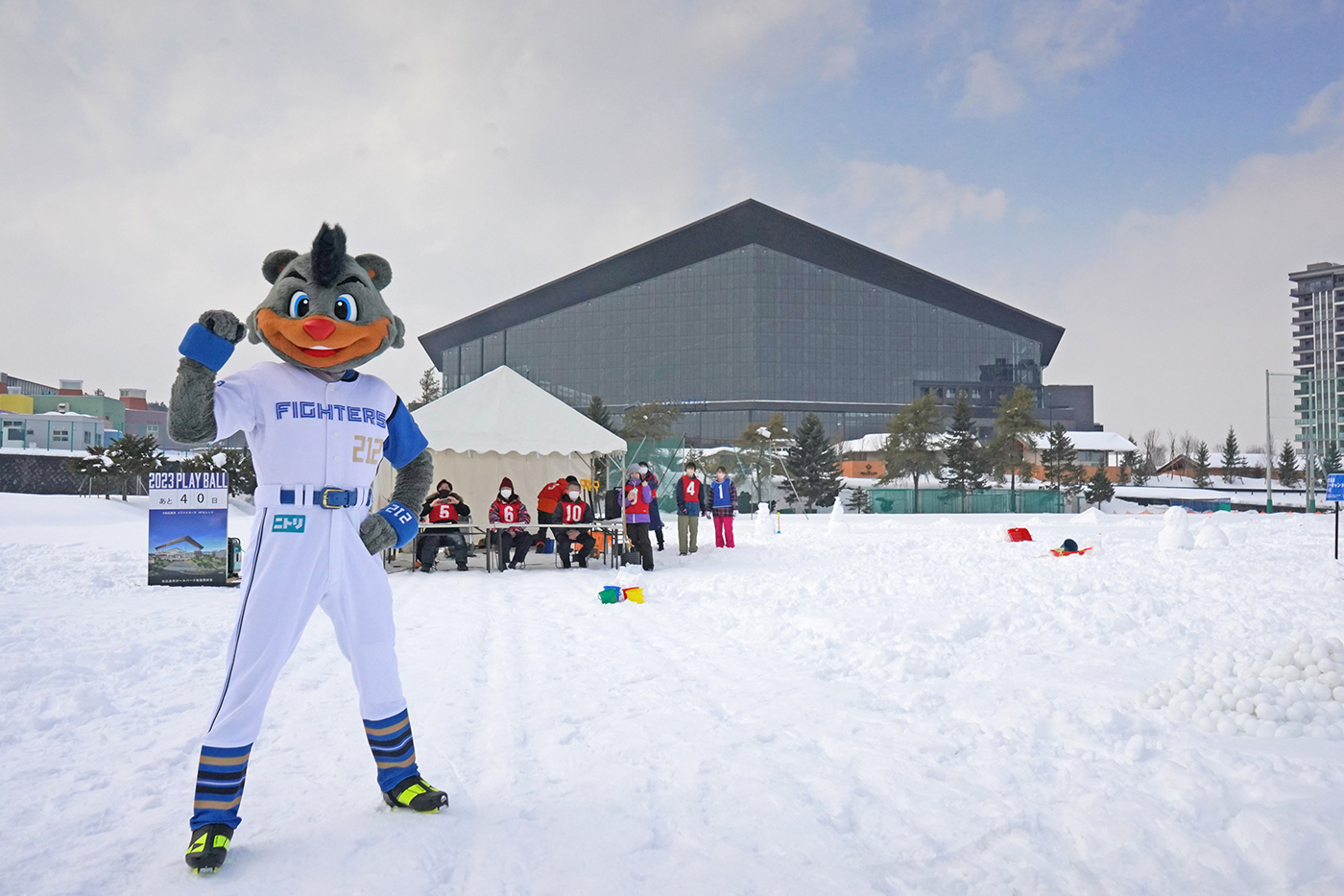 「開幕まであと40日」のボード前で エスコンフィールドを背景に撮影📷