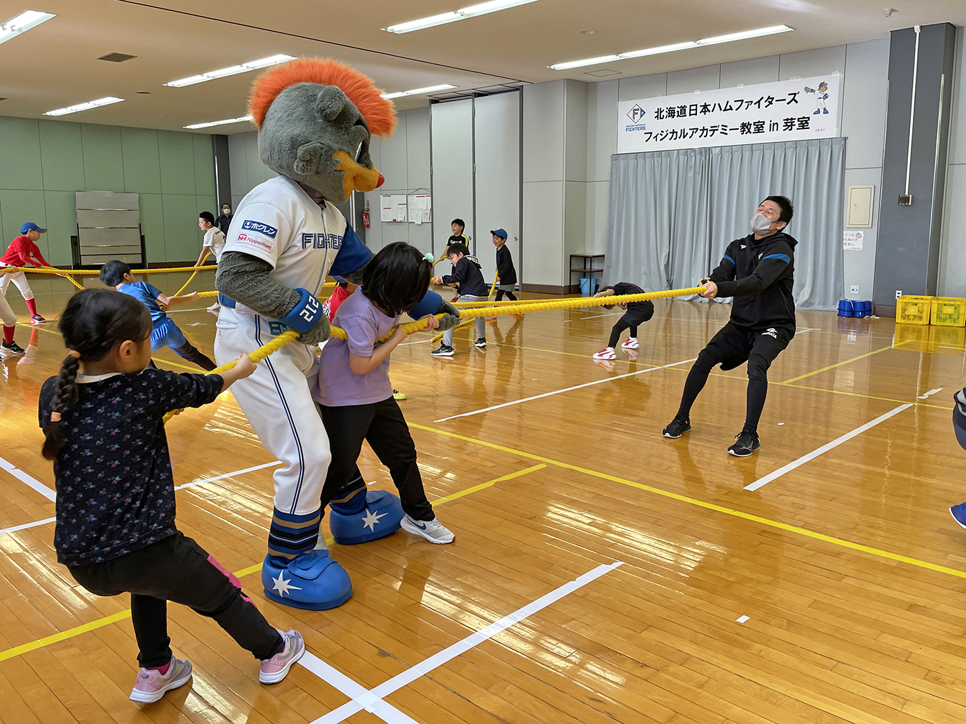 自分を引き寄せる綱引き、体育館で床が滑るでしょうけど、しんどそー!💦自重があり過ぎる体の大きな大人なので、自分は多分無理っス、ハイ😫💦