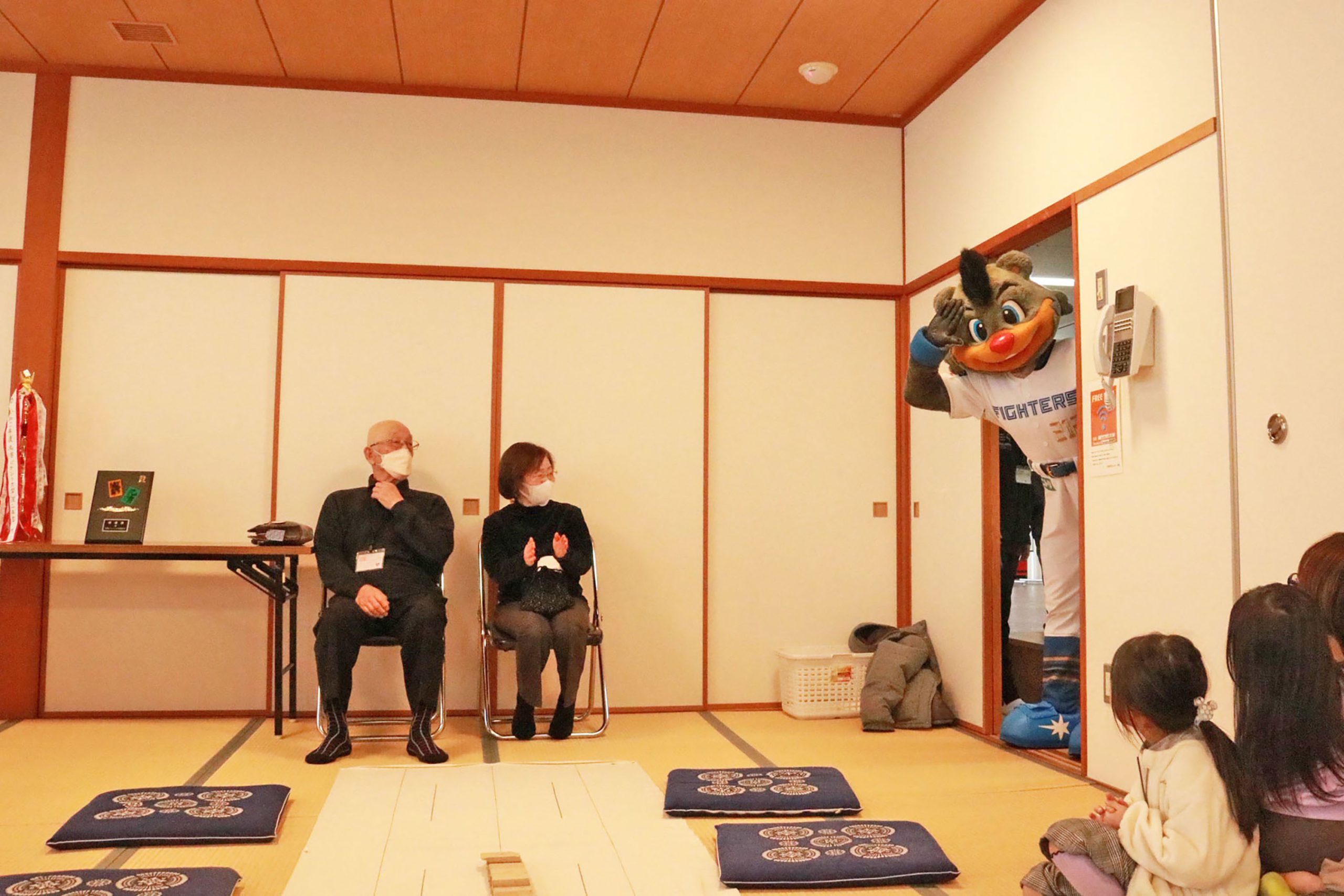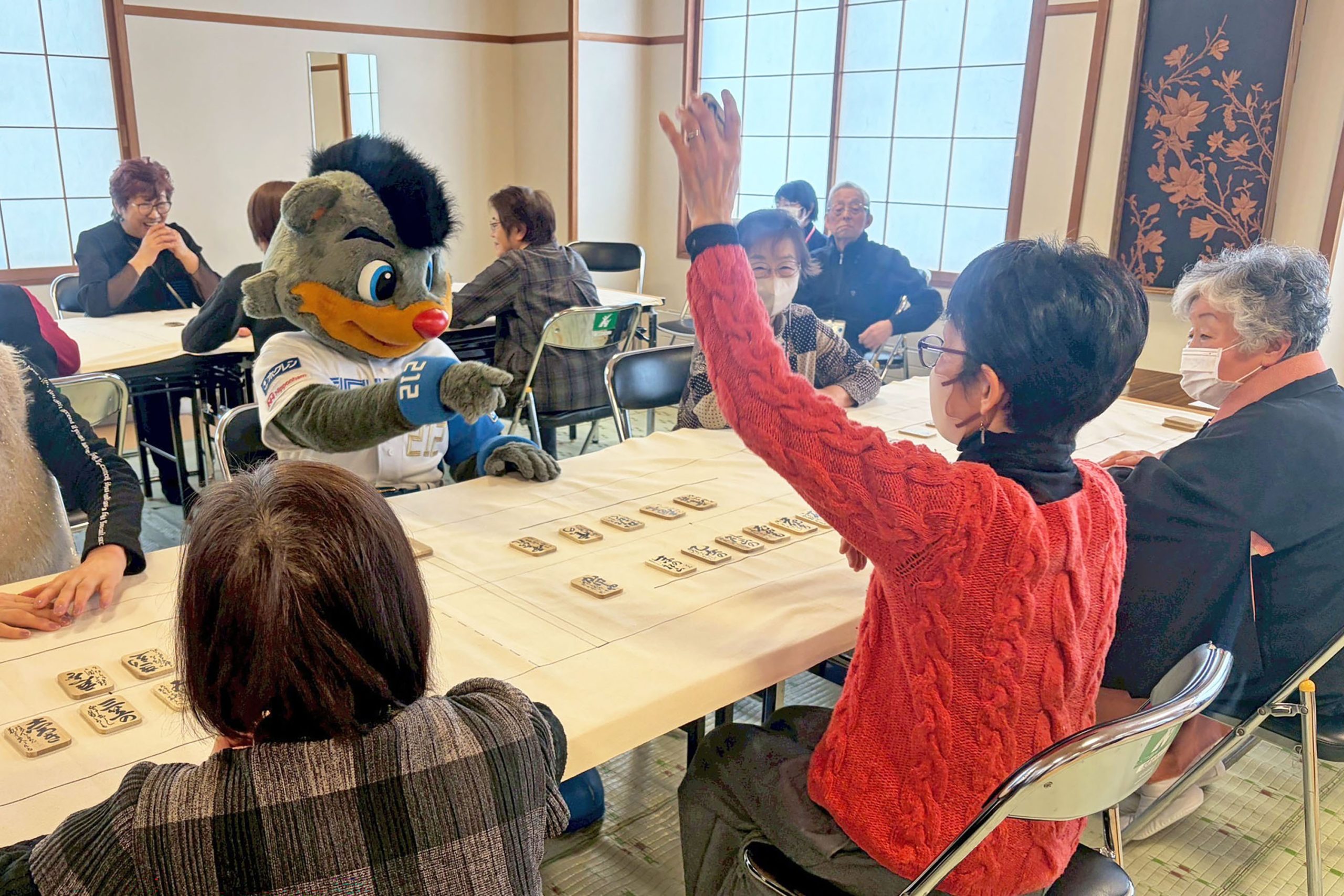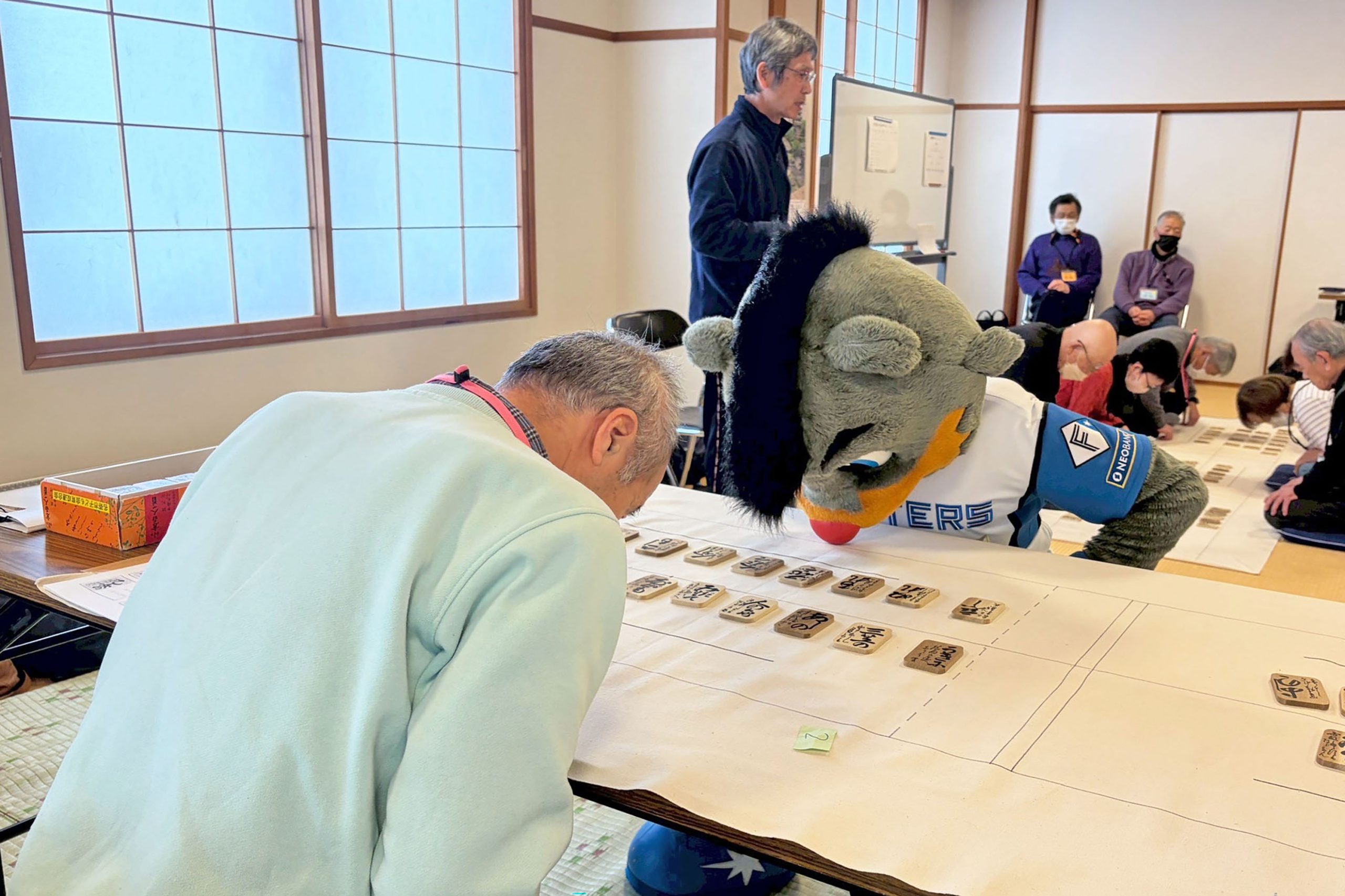 手前で座敷に座ってプレーする皆さんは