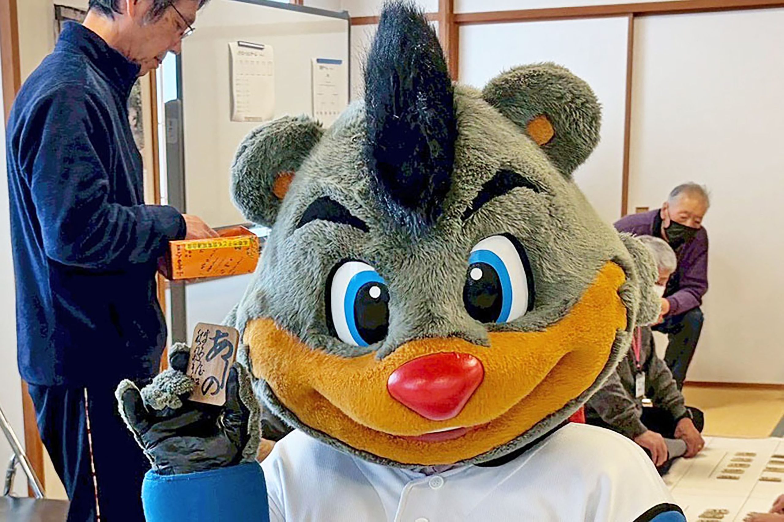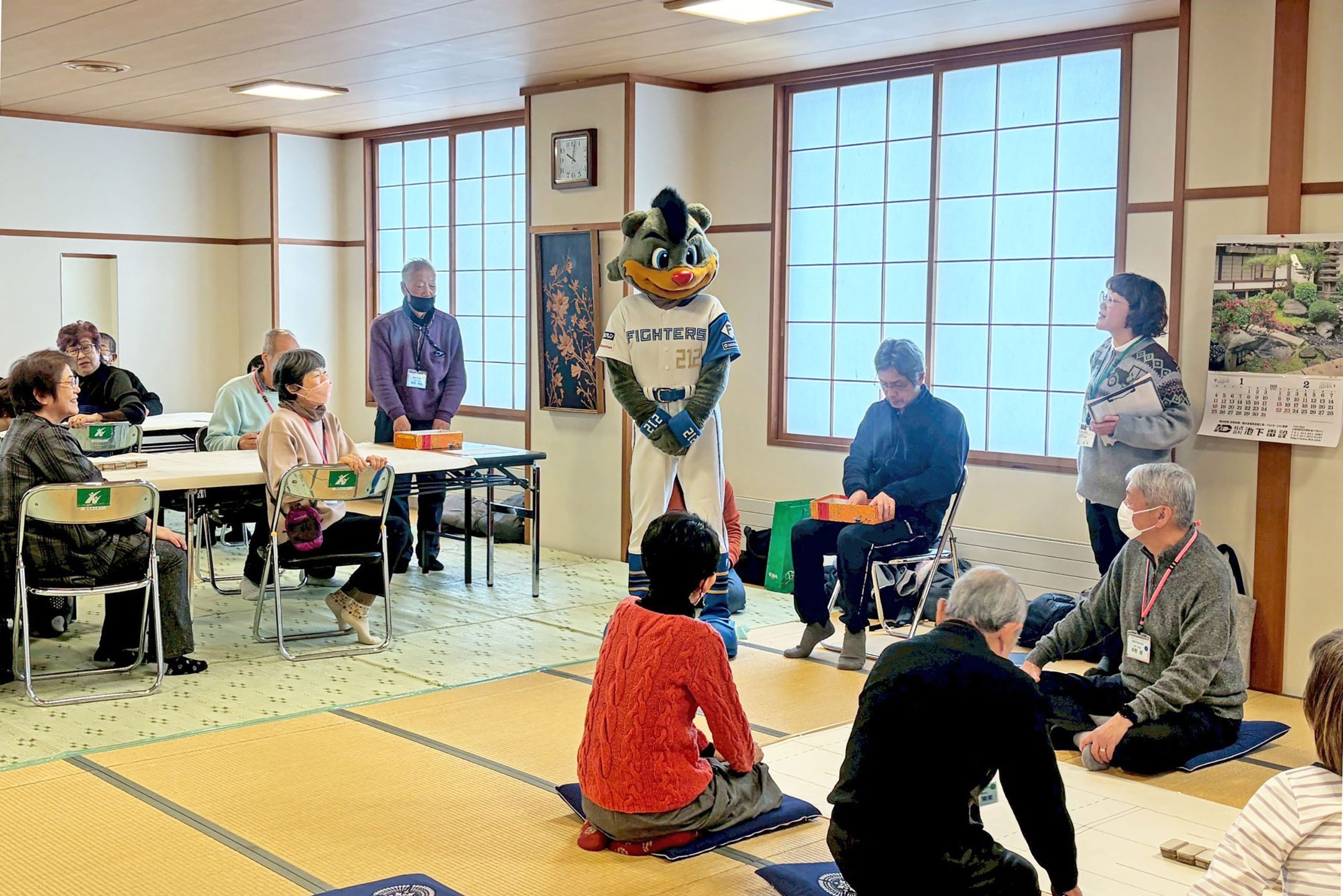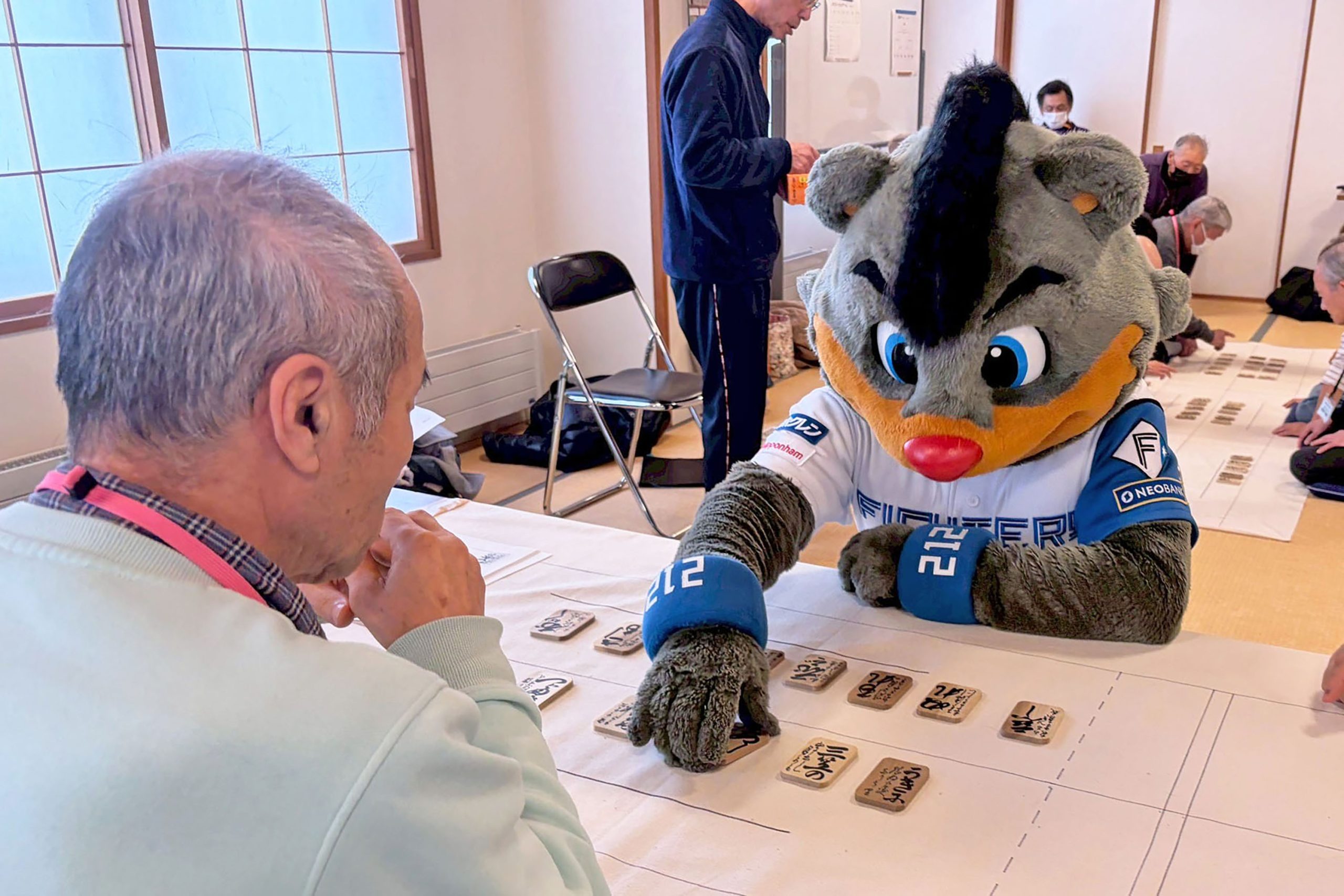 手前で座敷に座ってプレーする皆さんは